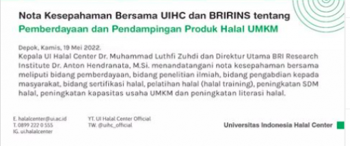 UI dan BRI Research Institute Berkolaborasi Wujudkan Akselerasi Sertifikasi Halal Dalam Mendorong UMKM Naik Kelas